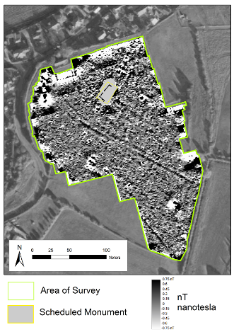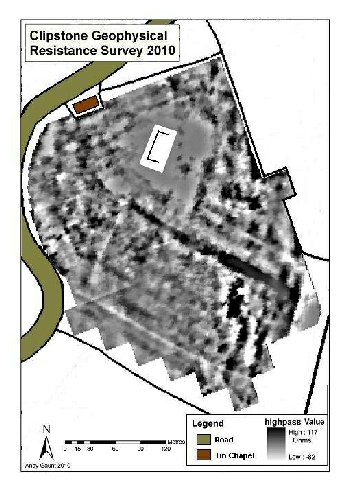This in turn led in 2010 to a Geophysical Resistance survey of the 11 acres of Castle Field (Gaunt 2010) with the intention of understanding the layout of the palace, in order to create a 3D model of the site, and relate the palace to the landscape in ArcGIS through 3D modeling. This survey led to a new interpretation of the palace site as being the same or similar to the 6-